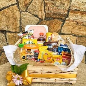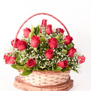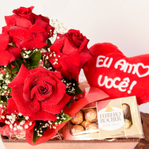 Cesta especial para presente com arranjo de rosas, pelúcia e chocolates