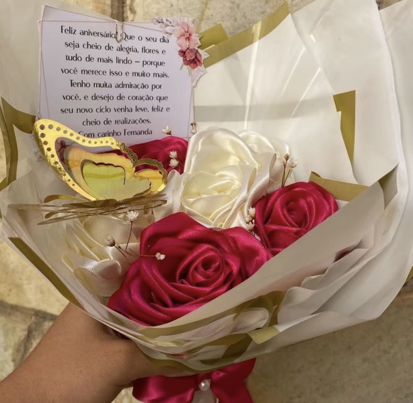 Buque de 6 rosas de cetim com laco para presente elegante e romantico