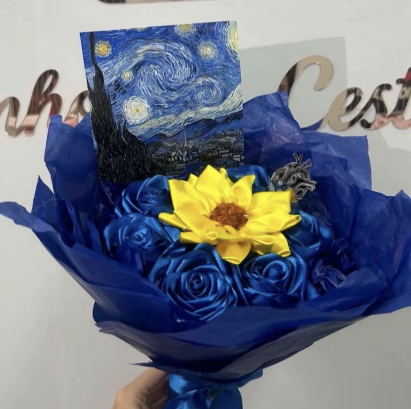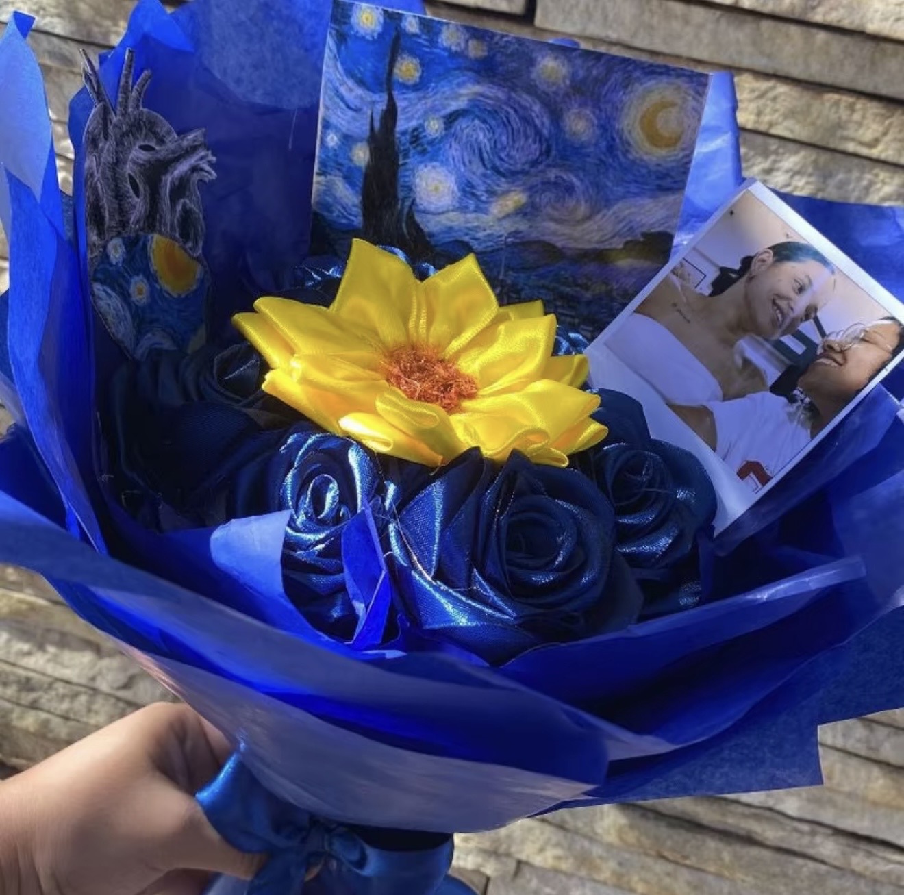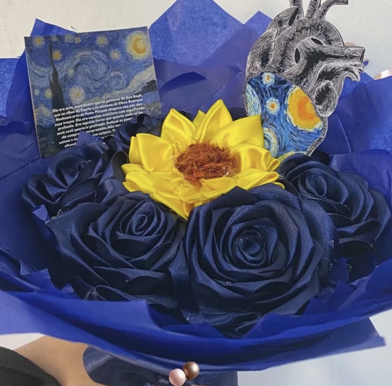 Buque de 8 rosas de cetim com 1 girassol e perolas