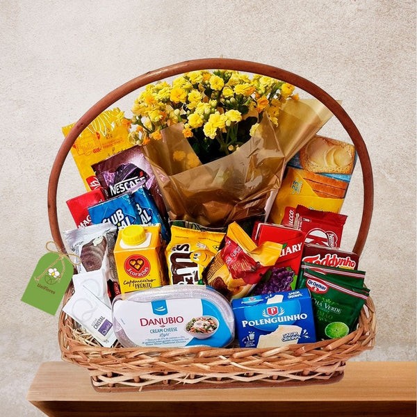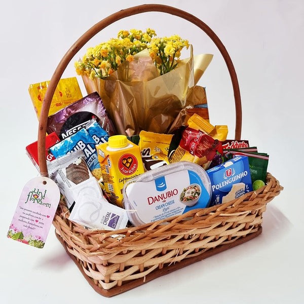 Linda cesta de vime decorada para presente e decorada com flores, e produtos para um delicioso café da manhã: um delicado arranjo de flores (kalanchoê, crisântemos, begônias ou flores da época), suco de Frutas 1l, Bolo de chocolate, Café Solúvel, Geléria de frutas Homemade, Sachês de Chá, Biscoitos Salgados, Bolinho Bauducco, Cookies Quaquer, Biscoito Waffer Bauducco, Biscoito Clube Social.